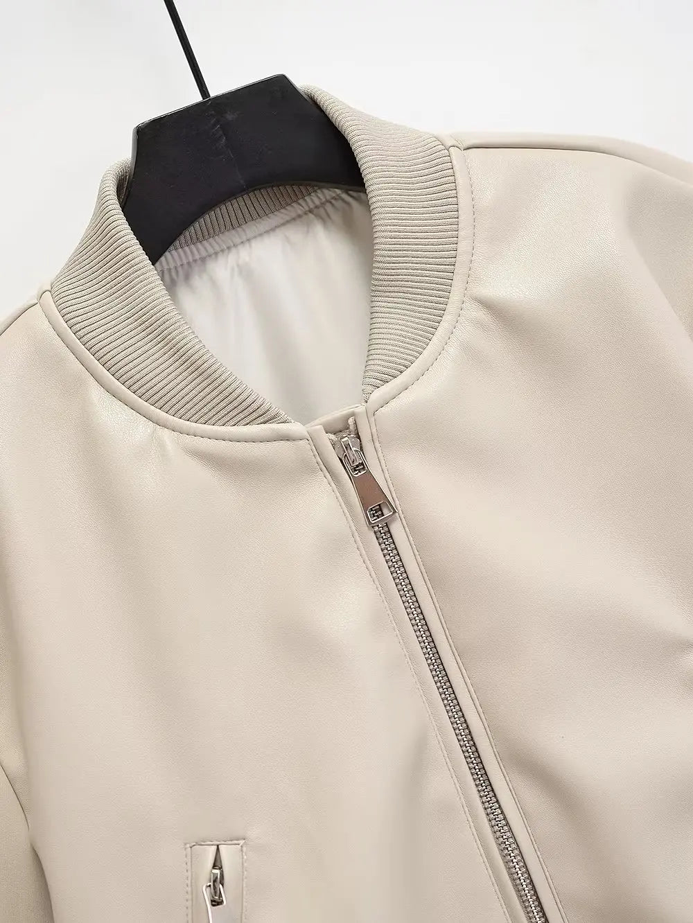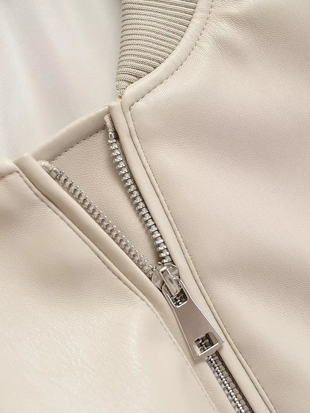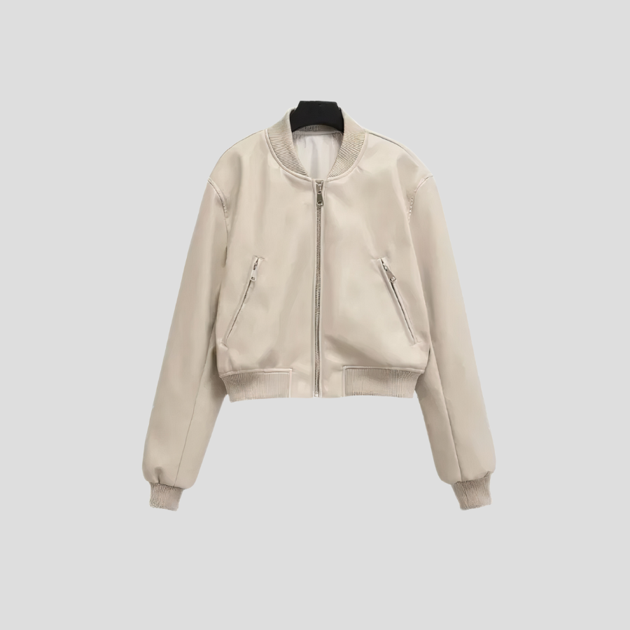 Beige punk rock bomberjakke med glidelåser og ribbestrikkede mansjetter