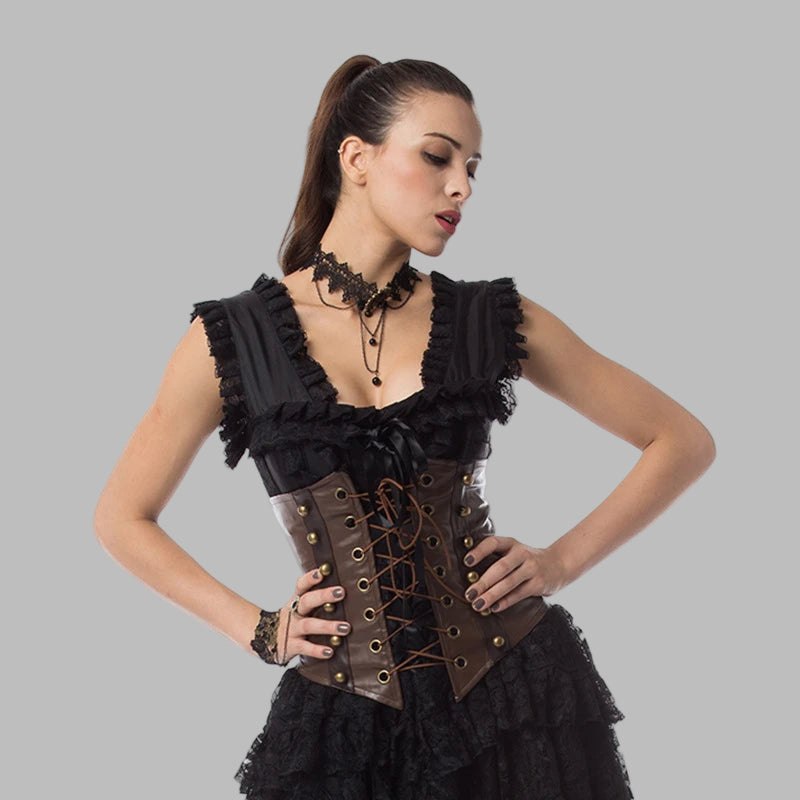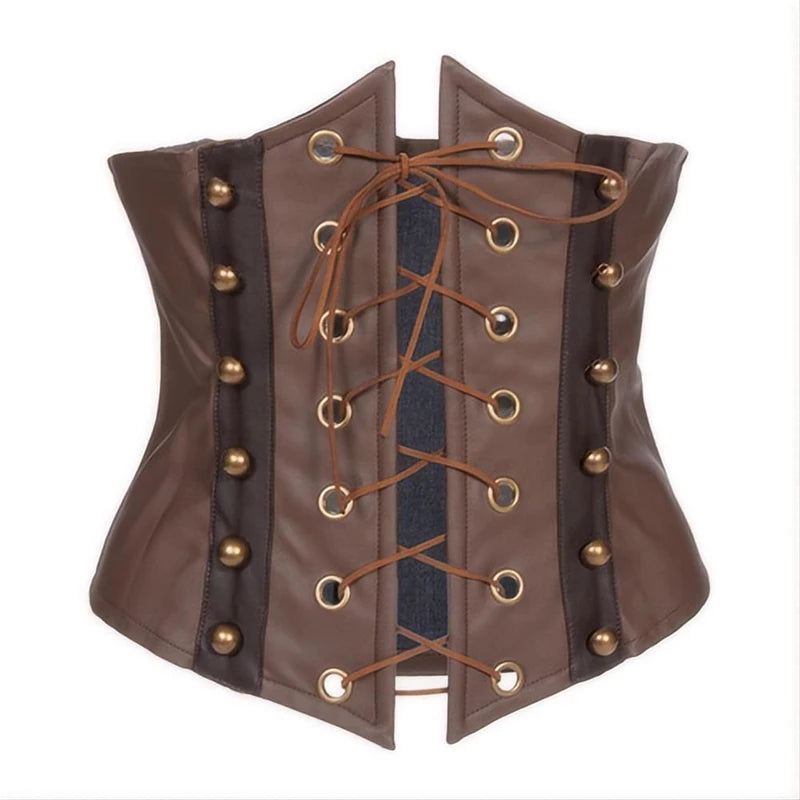 Brun steampunk-korsett i skinn med snøring og knapper Se alternativer