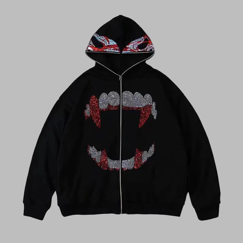 Damehettegenser med glidelås, svart gotisk med vampyrtenner