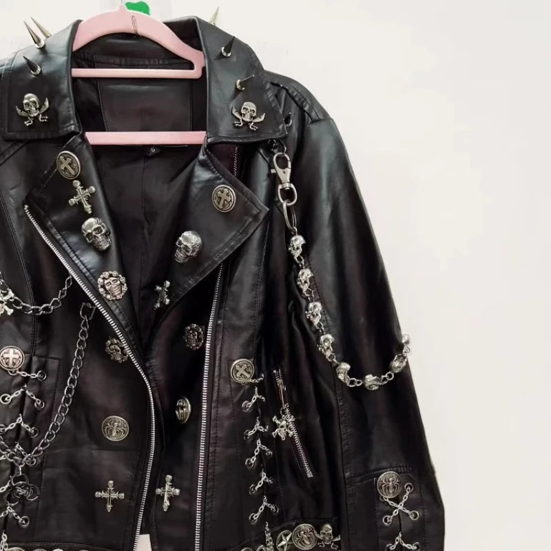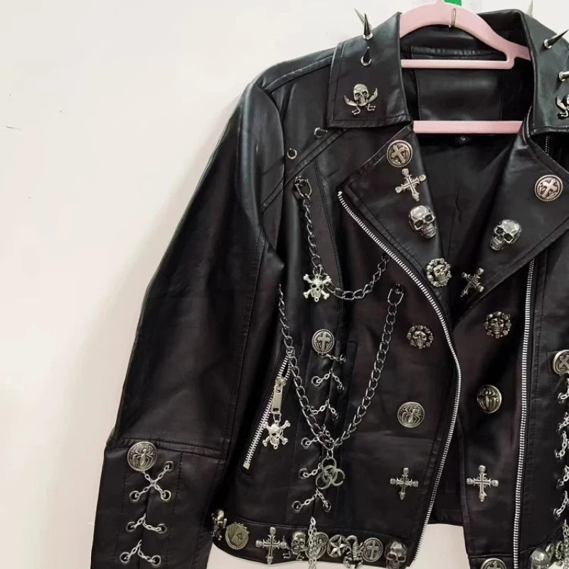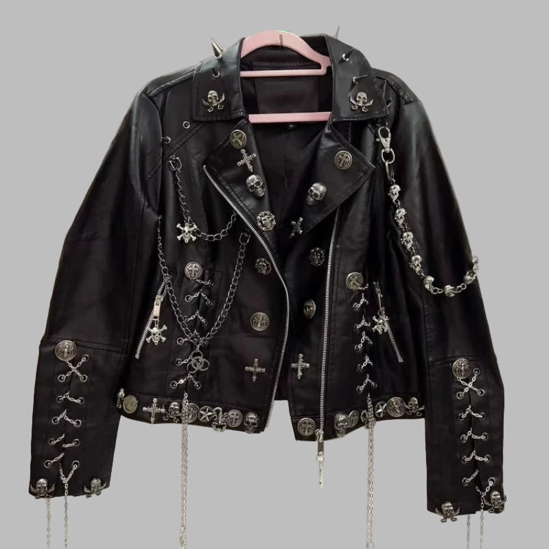 Damejakke i svart skinn, gotisk stil med nagler, kjeder og kors