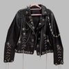Damejakke i svart skinn, gotisk med nagler, kjeder og kors
