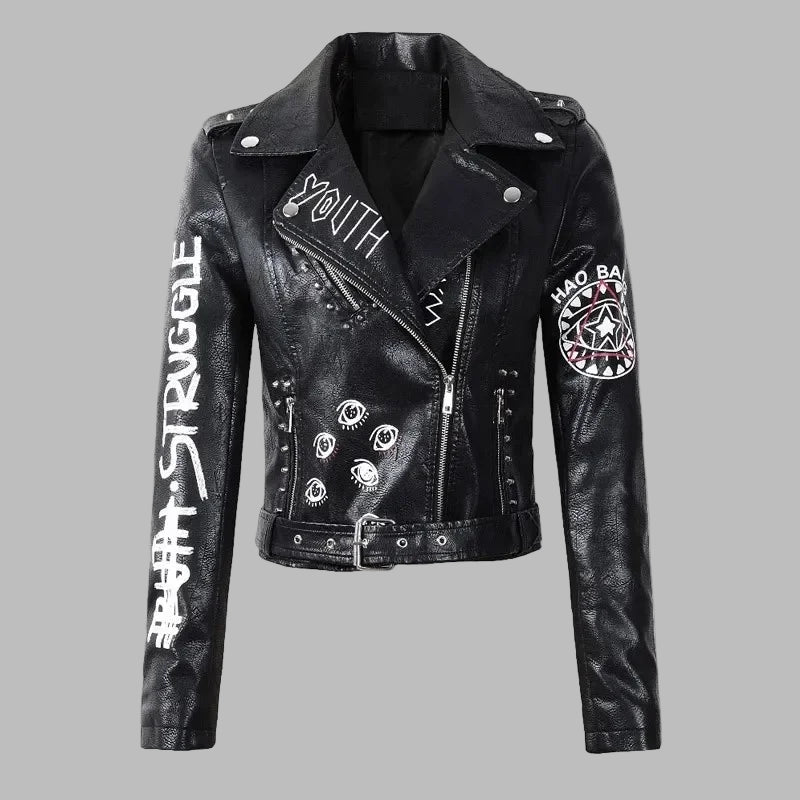 Damejakke i svart skinn, punk/goth grunge med nagler og trykk