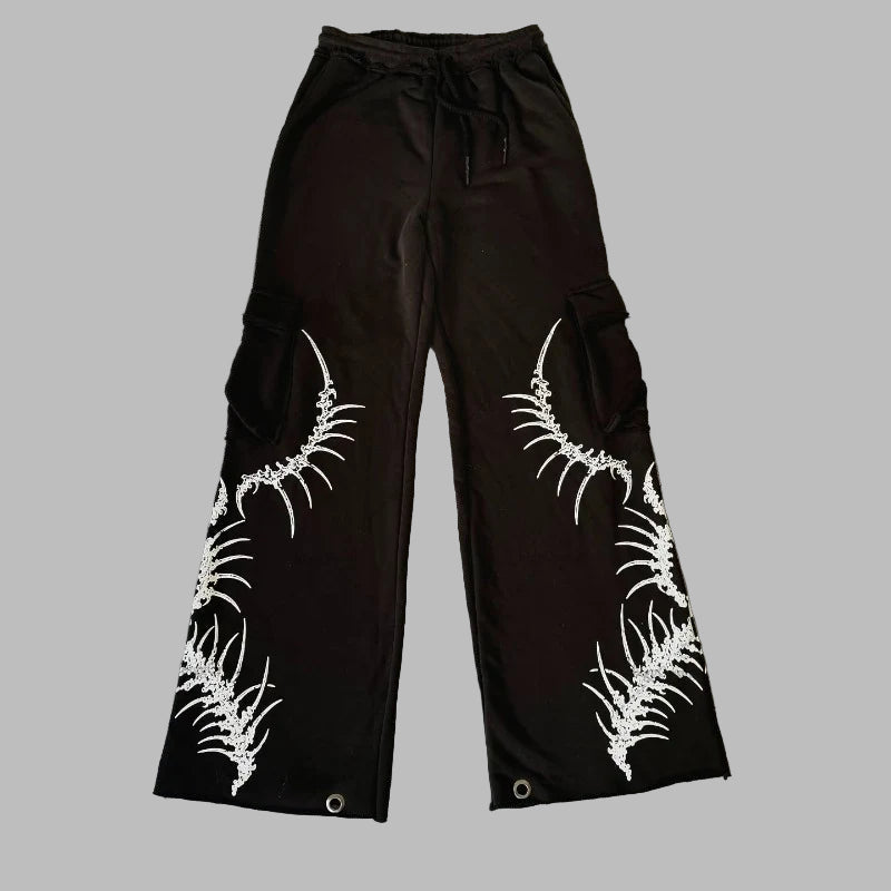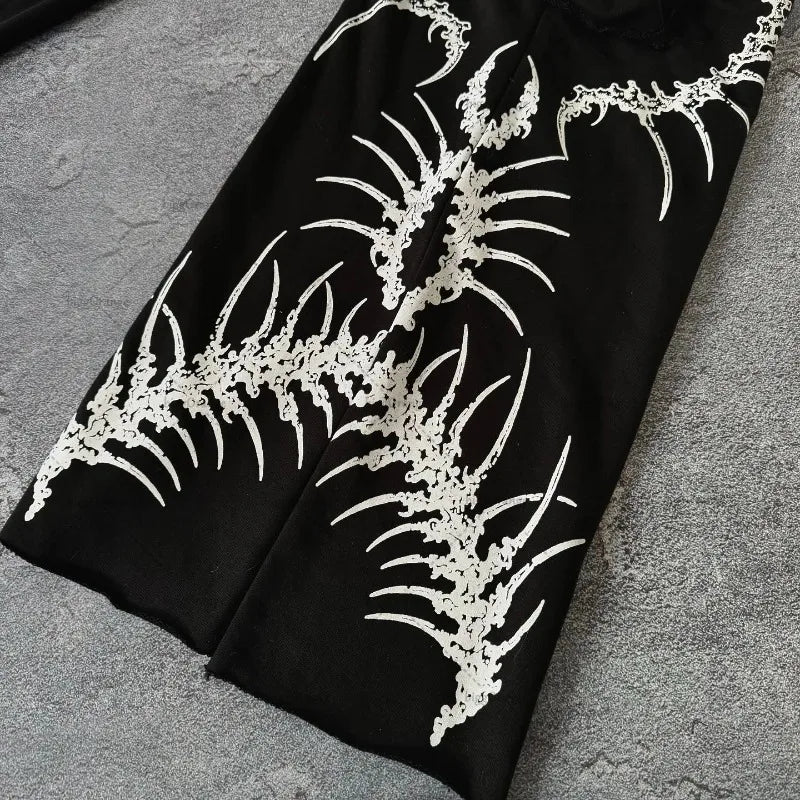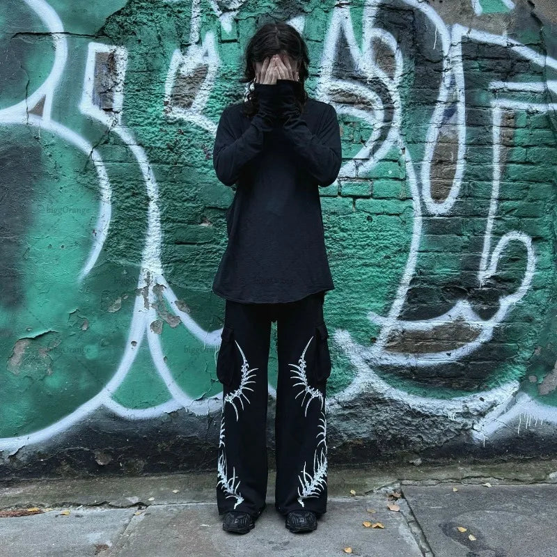 Gotiske grunge-bukser med skjelettbein-print, darkwear style