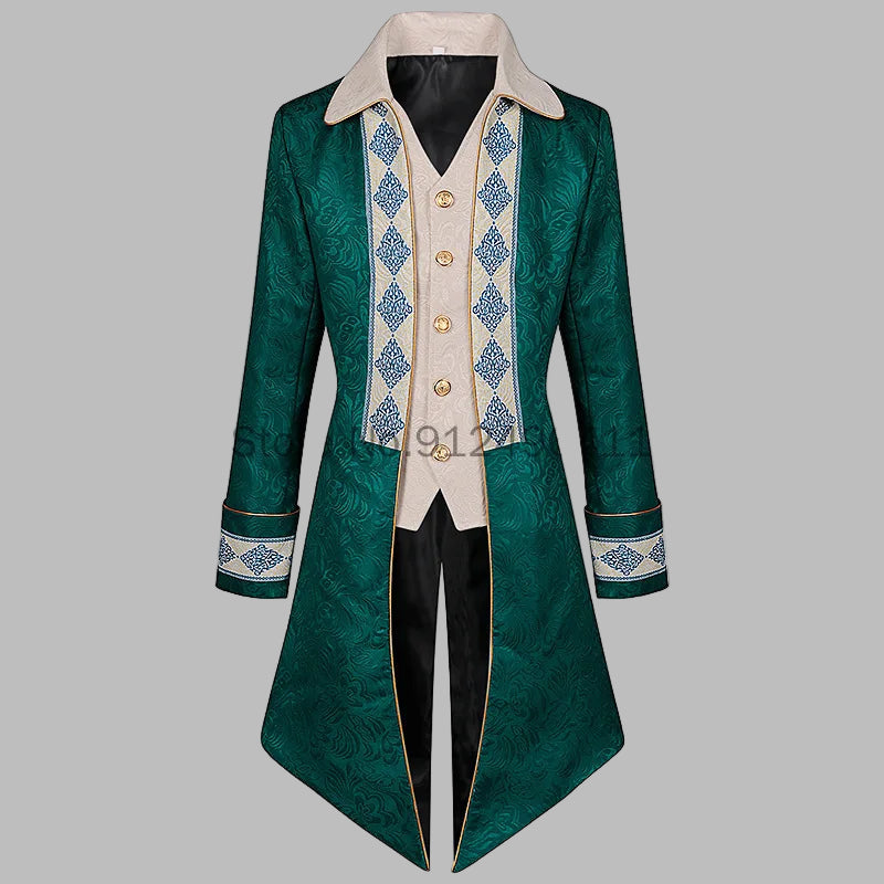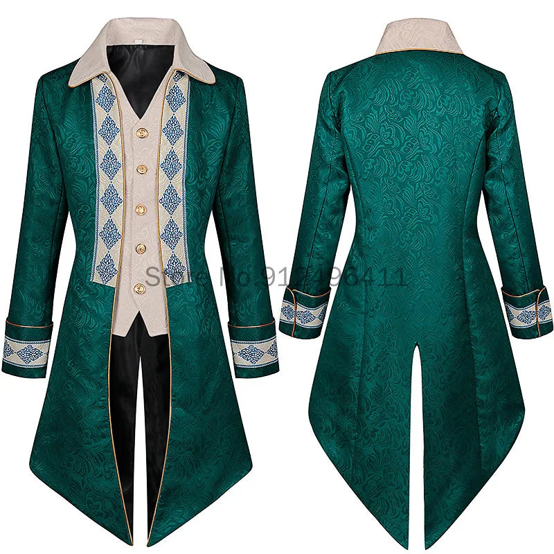 Grønn steampunk-frakk med ornamentale detaljer, elegant herremodell