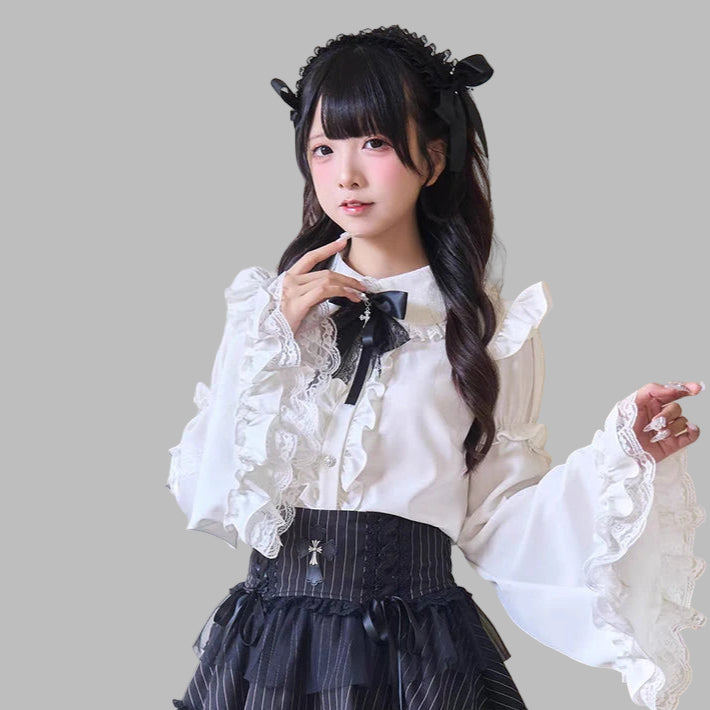 Hvit gotisk bluse med svart blonde og Jirai Kei Lolita-sløyfe