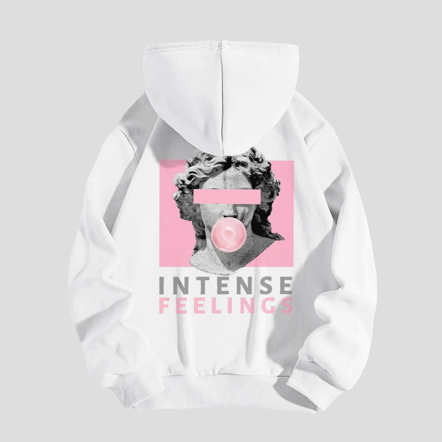 Hvit pop art-genser med rosa Intense Feelings-grafikk