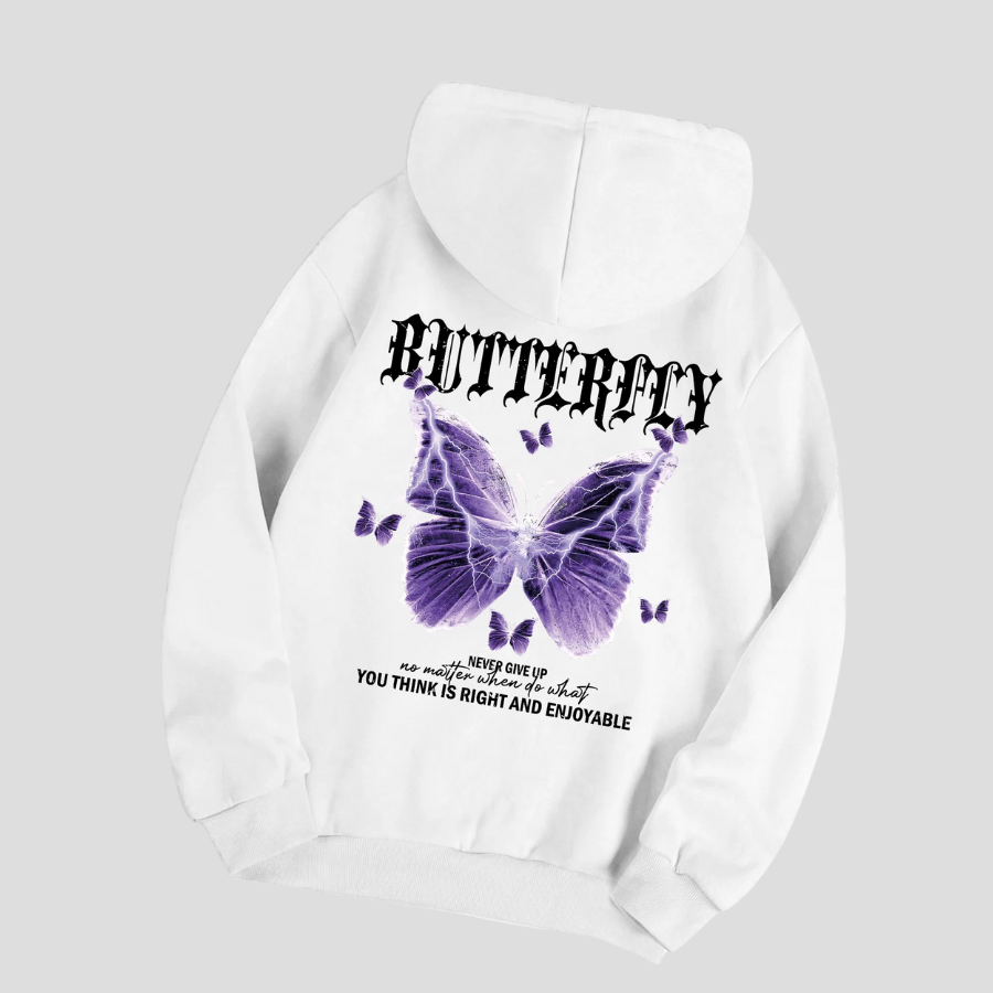 Hvit punkhettegenser med lilla sommerfugler og tekst