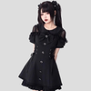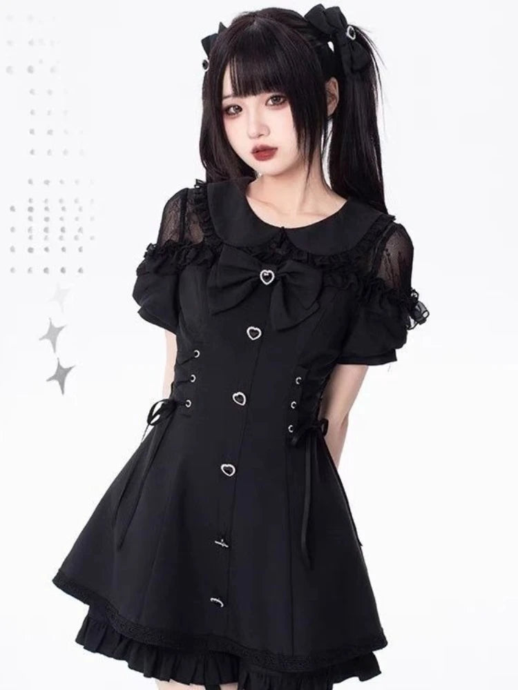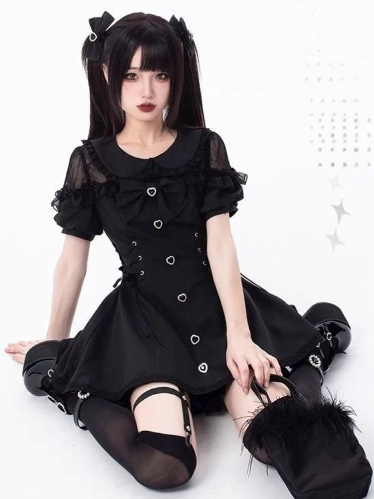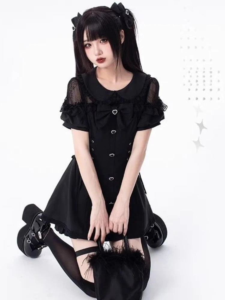 Jirai Kei svart kjole med hjerteknapper og volanger