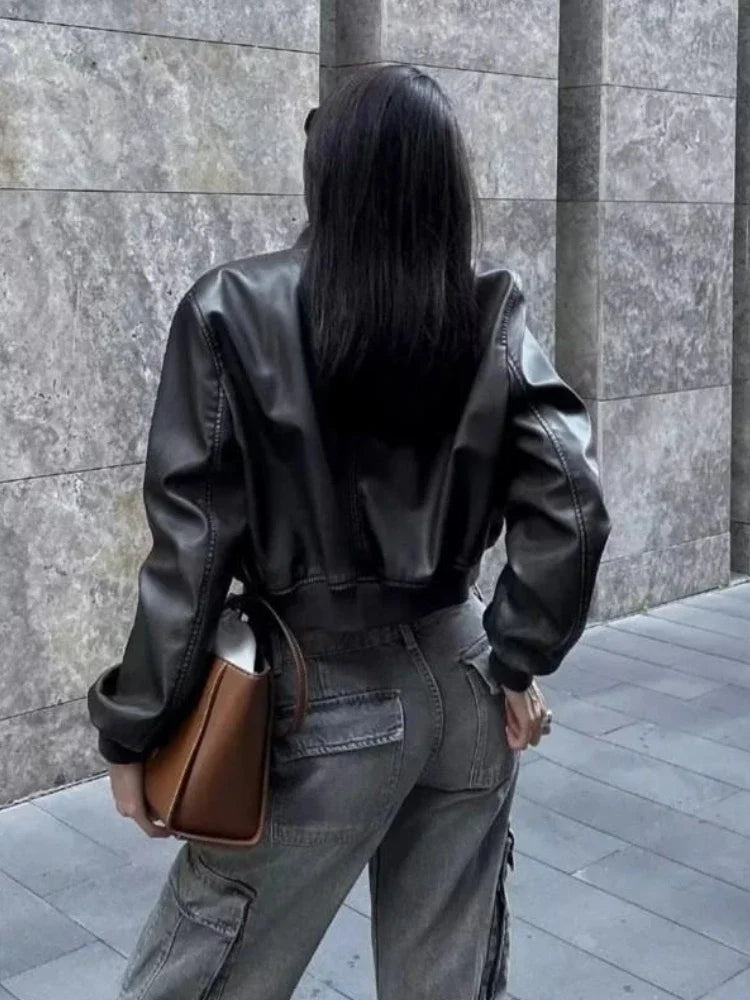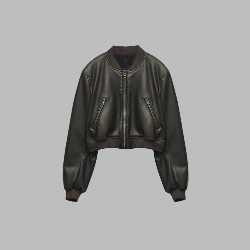 Kort svart skinnjakke med rock/goth-stil og glidelåser for dame