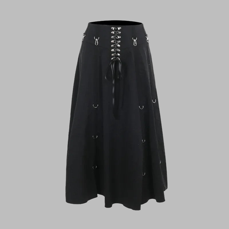 Lang svart gotisk asymmetrisk skjørt med korsett og volanger