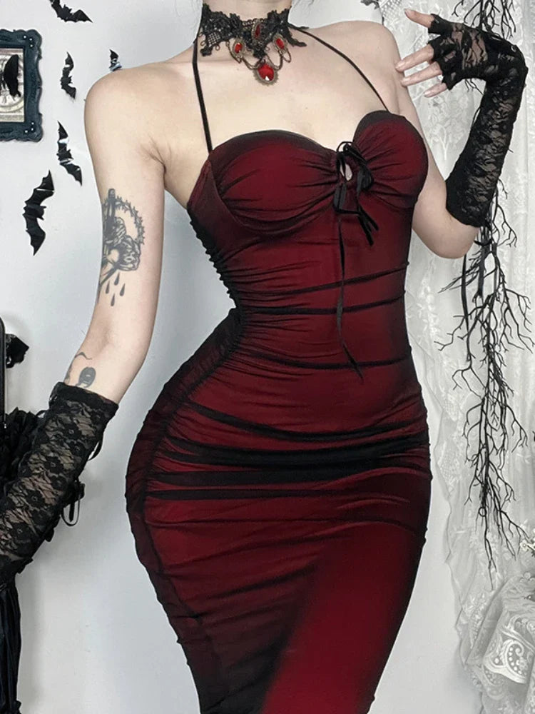Lang burgunderrød gotisk havfruekjole med splitt og blonde