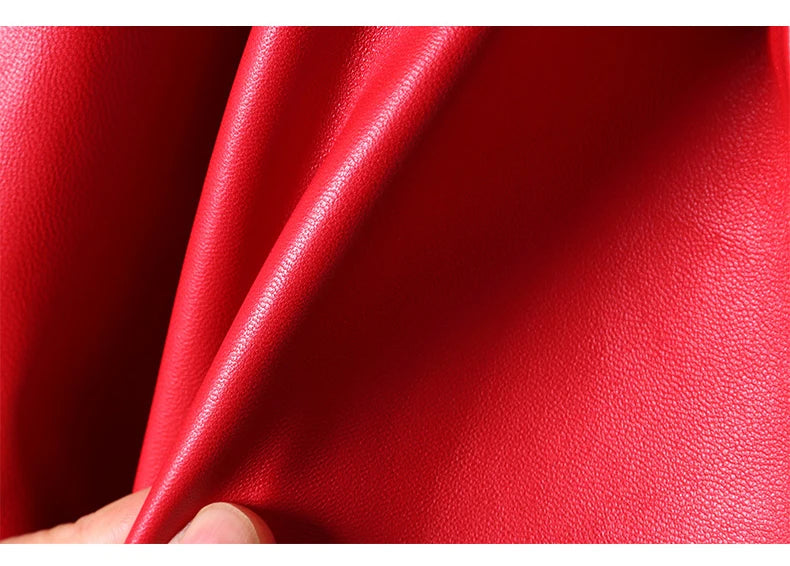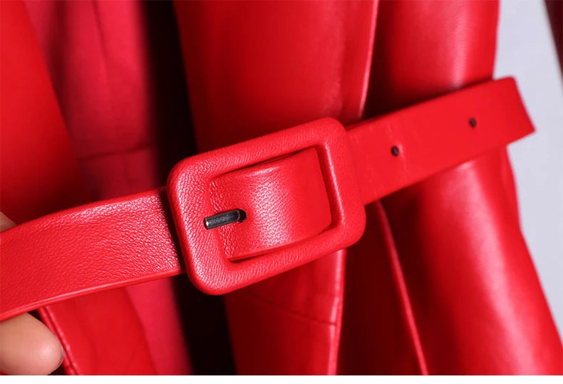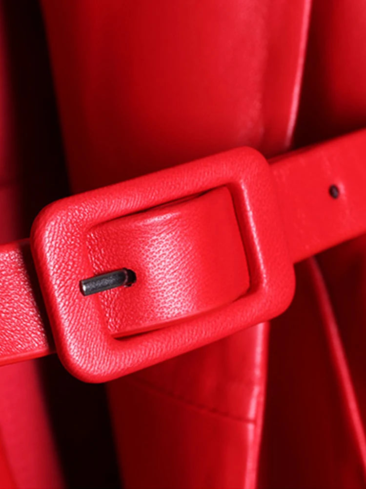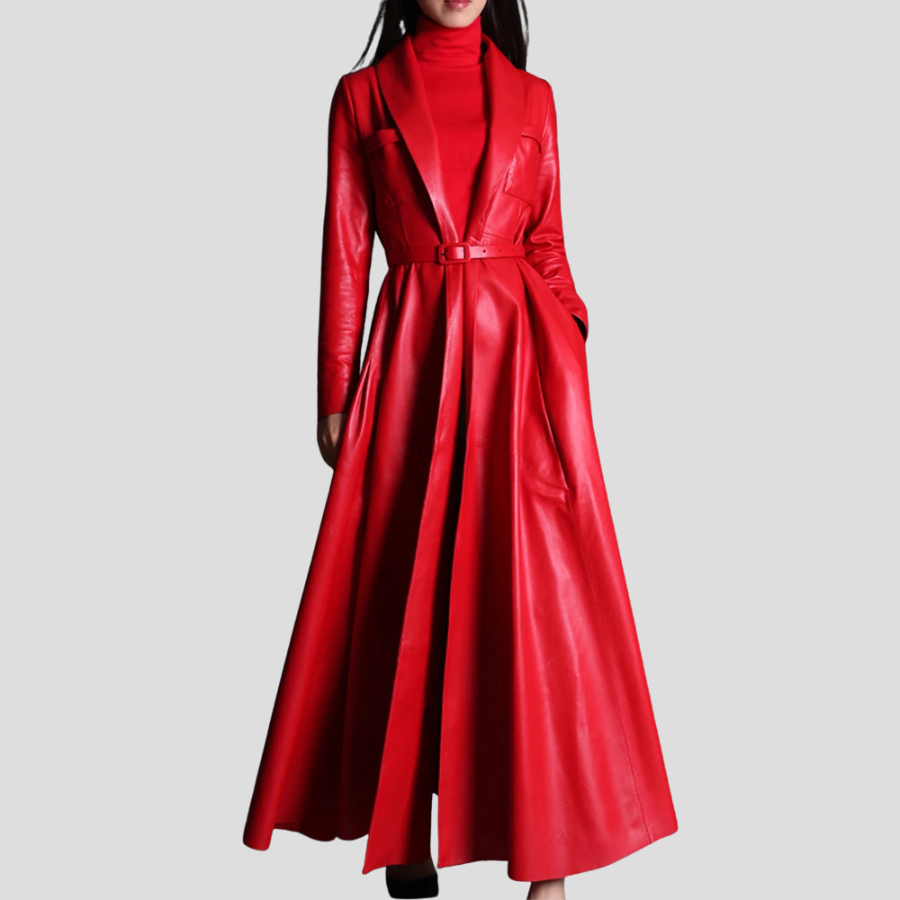Lang rød skinnfrakk i rockestil med belte Se alternativer