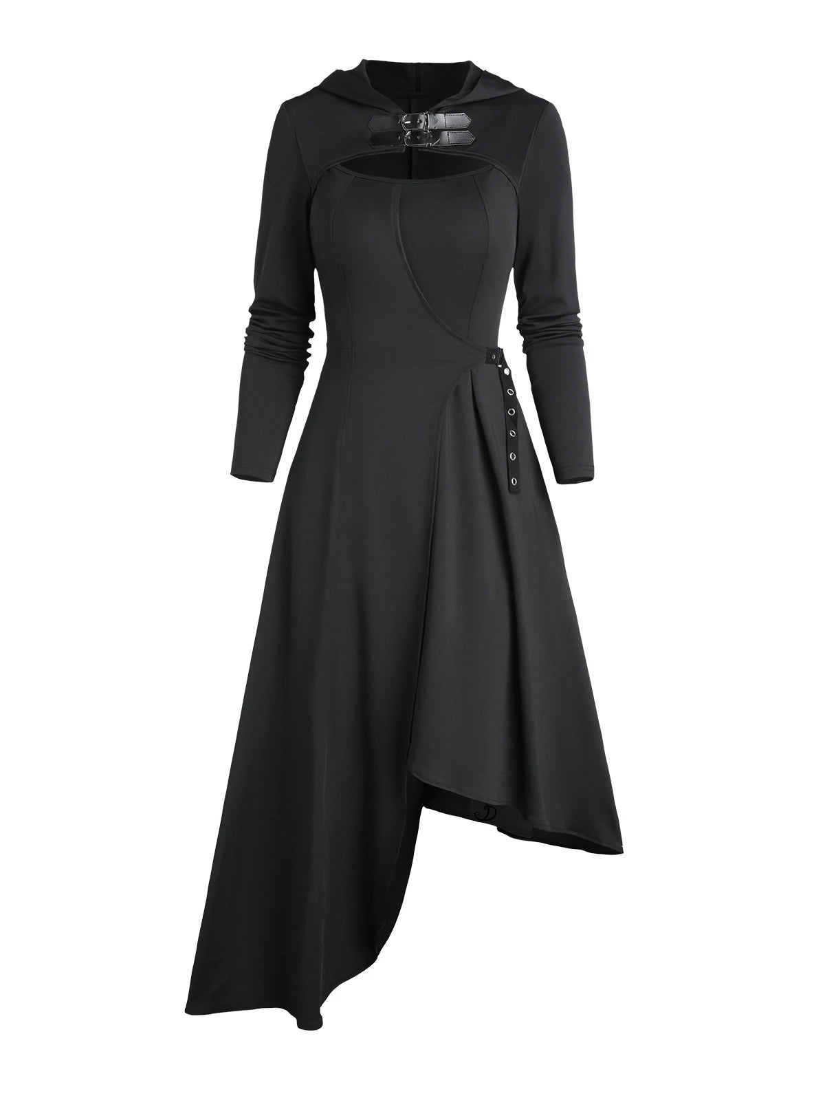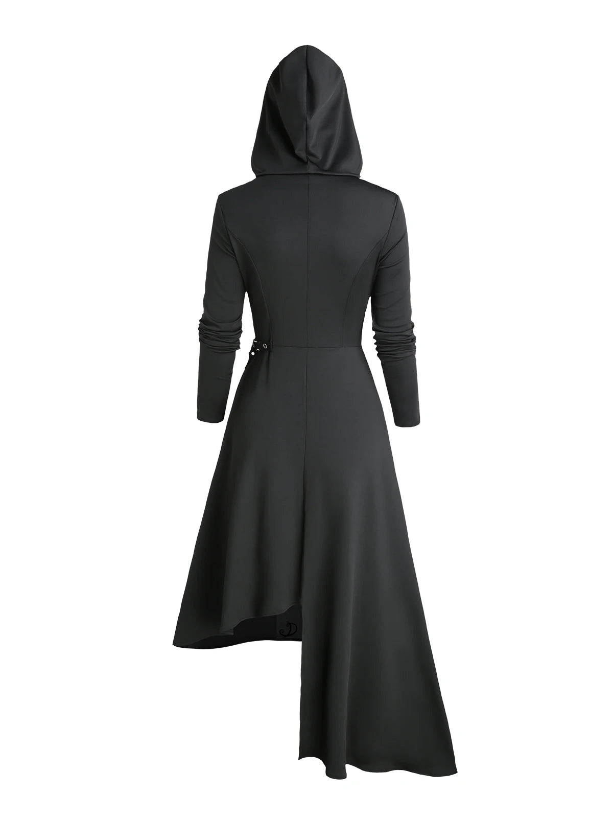 Lang svart asymmetrisk kåpe med hette og belte Se alternativer