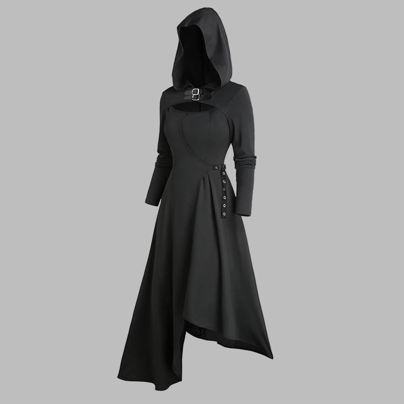 Lang svart asymmetrisk kåpe med hette og belte