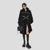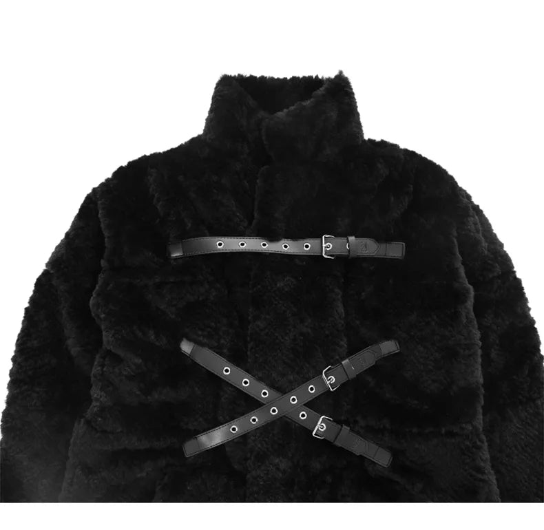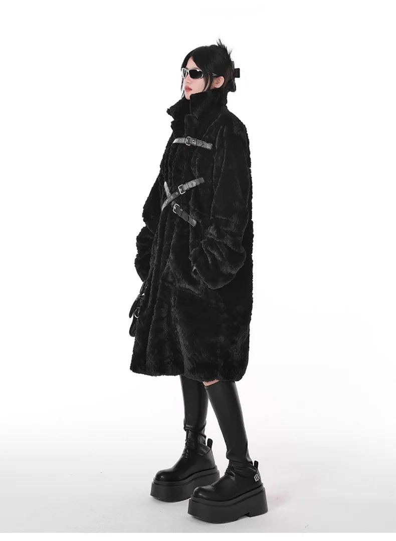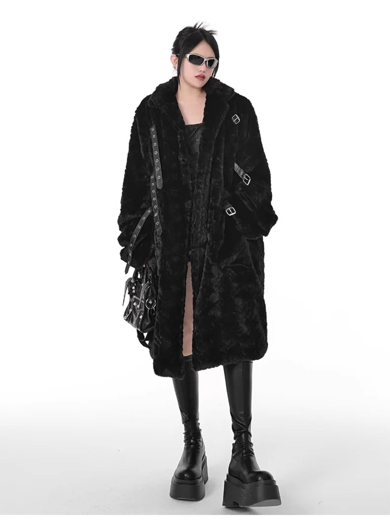Lang svart punk-metalfrakk med belter og fuskepels