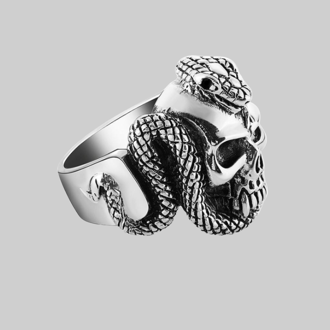 - Form: hodeskalle og korslagte bein, slange