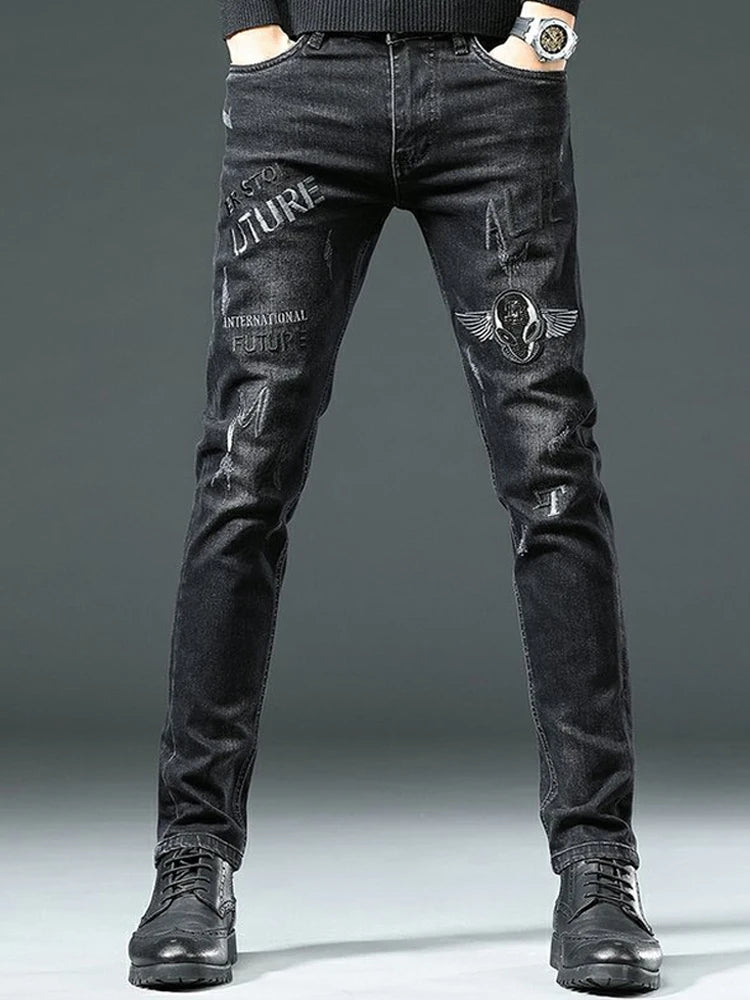 Punk svarte jeans med trykk og vinger