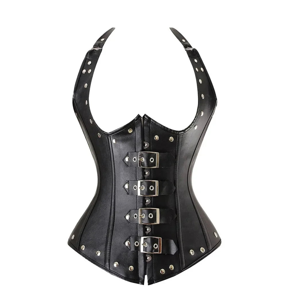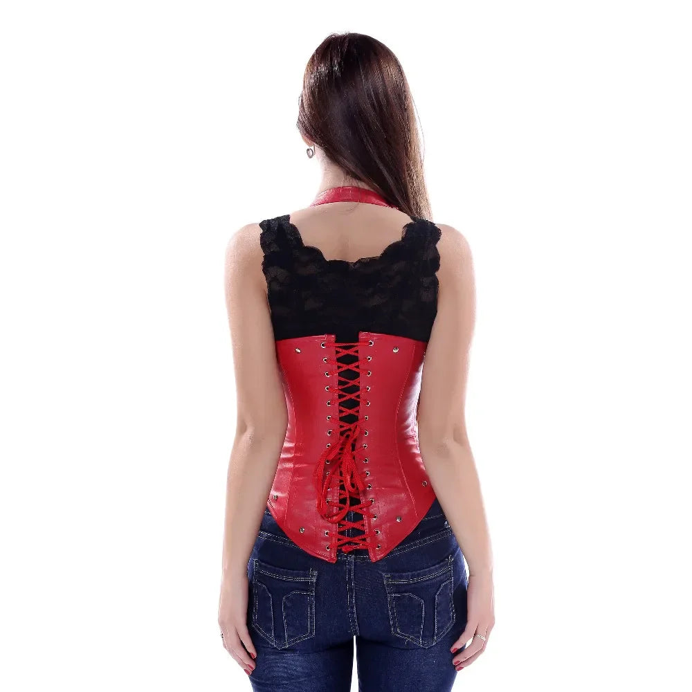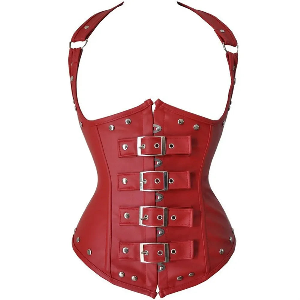 Rød korsett i imitert skinn med spenner – punk rock-stil for damer