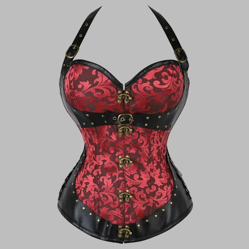 Rød steampunk-korsett i brokade med svarte skinndetaljer og spenner