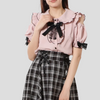 Jirai Kei rosa bluse med svart sløyfe, kort erm