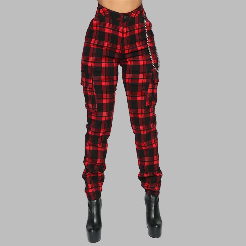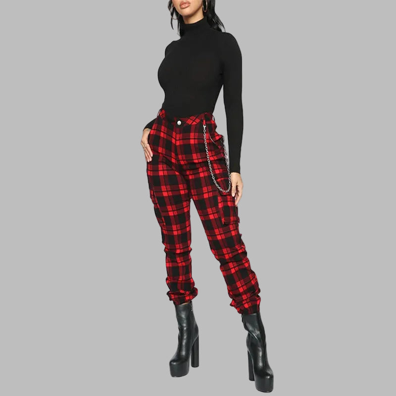 Smal punkbukse i rød og svart rutemønster med kjetting