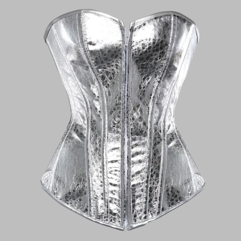Sølvfarget metallkorsett med slangeskinnseffekt og spiler