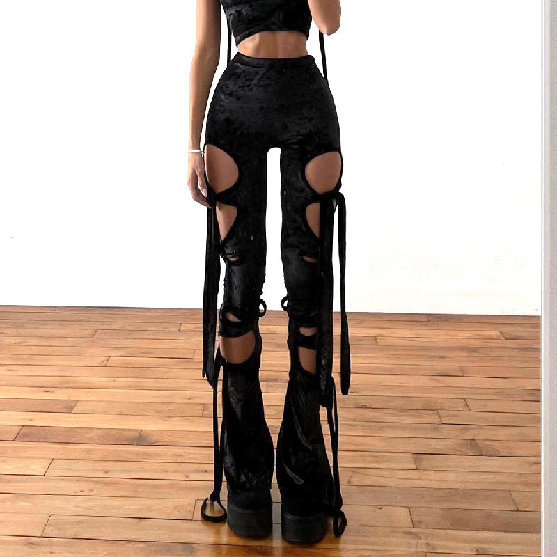 • Unike Detaljer: Detaljer som "Hollow Out", vintage og bandasje gir en kunstnerisk dimensjon til disse gotiske buksene. Disse elementene skaper en visuelt fengslende estetikk og fremhever samtidig buksens mørke karakter.