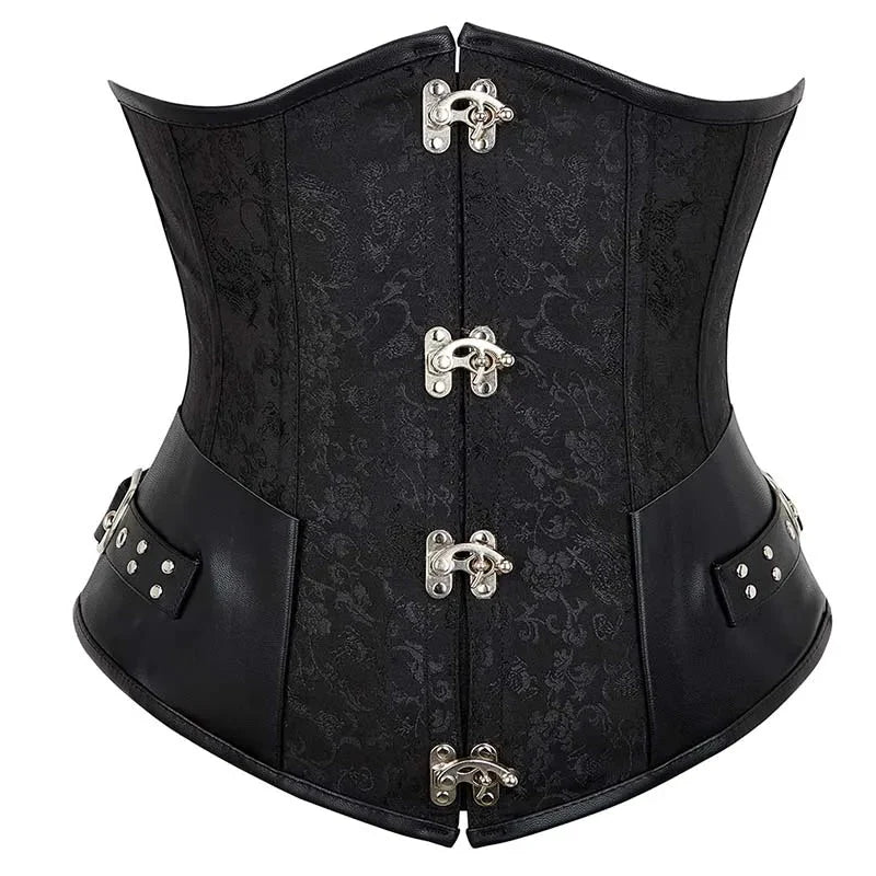 Dette steampunk-underbystkorsettet med et markant design former figuren med karakter. Utstyrt med 12 stålspiler gir det sterk støtte og en slankende effekt i midjen. Ideelt for arrangementer, kveldsutflukter, cosplay eller som et sterkt innslag i hverdagsstilen. Matchende stringtruse i settet.