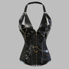 Svart gotisk steampunk-korsett med kjeder, glidelåser og skinnstropper