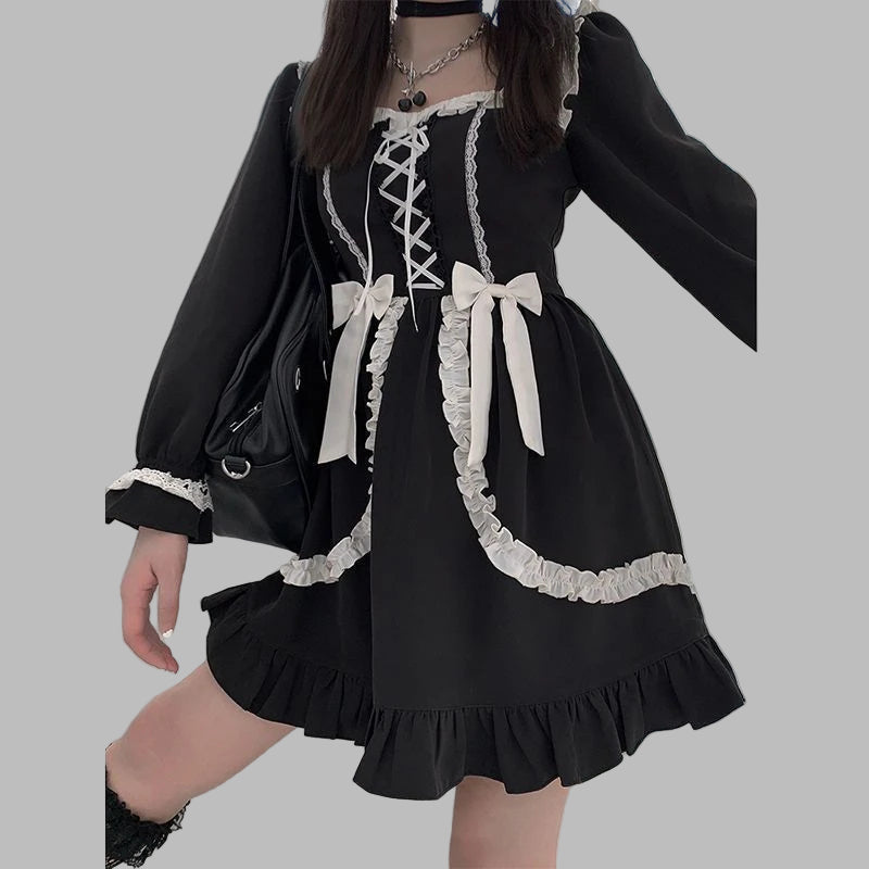 Svart Jirai Kei-kjole med hvite sløyfer og snøring