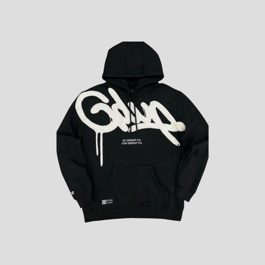 Svart metal-hettegenser med hvitt logo og tekst