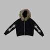 Svart punkjakke med pelskantet hette og metallmønster
