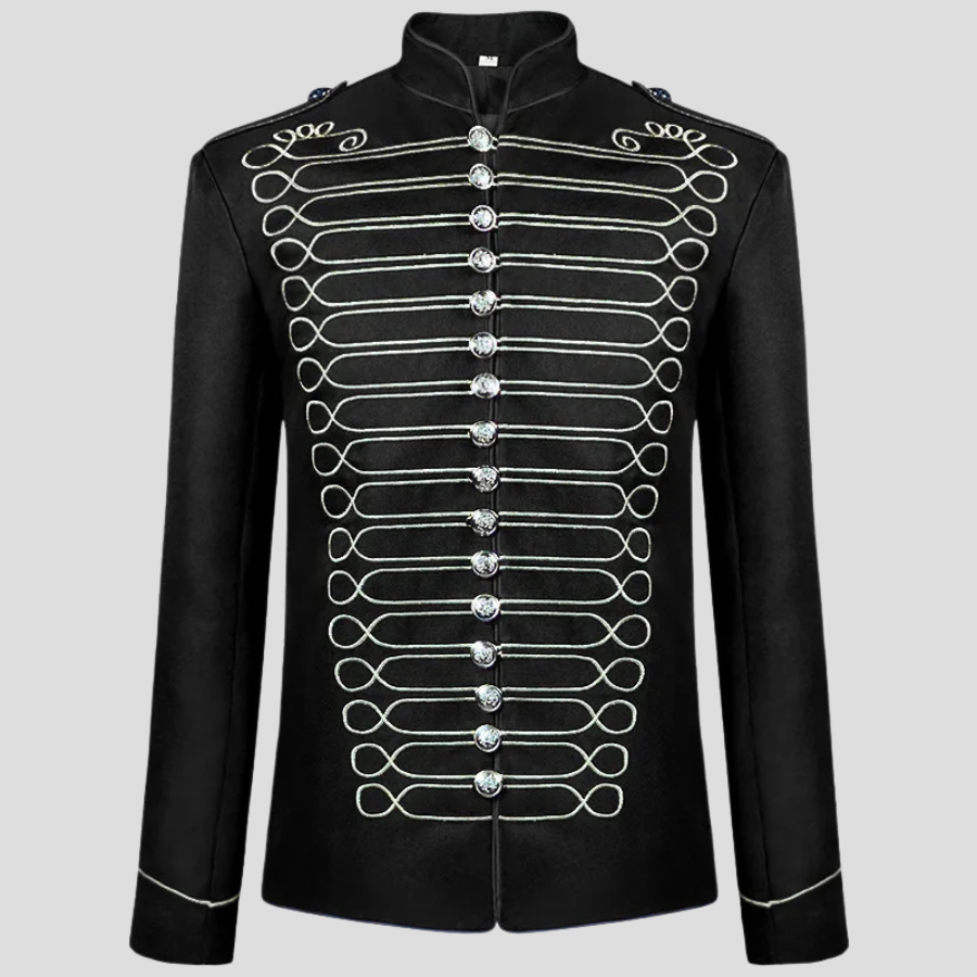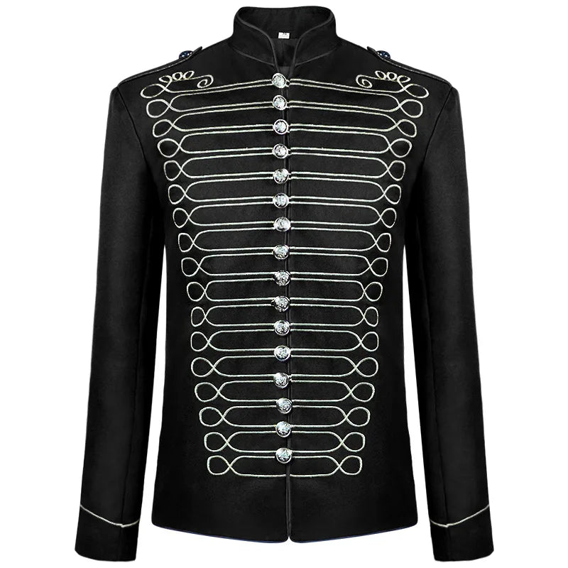 Svart steampunk-herrejakke med hvite dekorative snorer